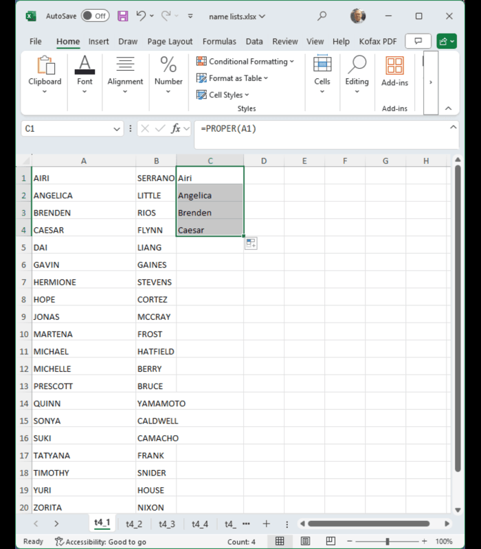Now apply the “PROPER” function to cell A1 in an empty cell and drag down. Now do the same for column 2