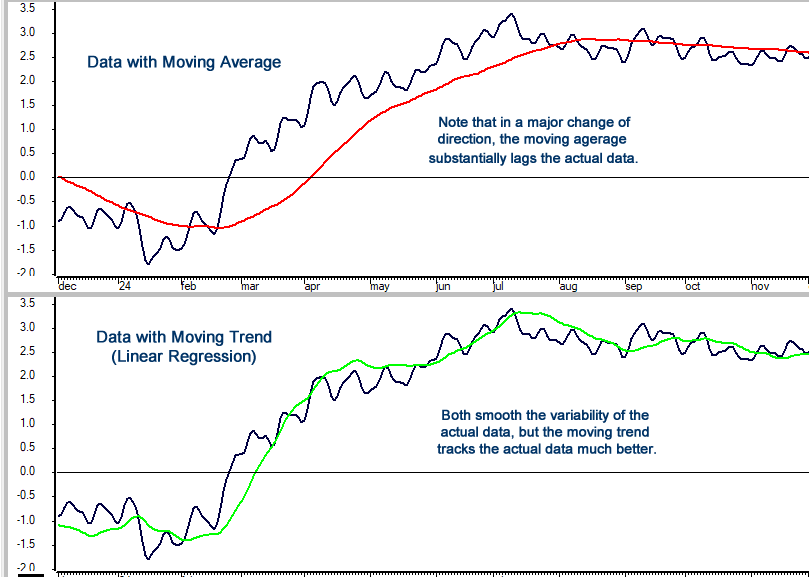 To achieve the smoothness of a moving average without the lag, consider moving trends, also known as moving linear regression. This method provides real-time insights by fitting a linear trend to a rolling window of data points, making it an essential tool for predictive analytics and business intelligence platforms like Excelerate®.